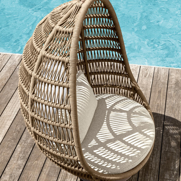 Scaunul din colecția Panama, cu formă de ou și bază rotativă, aduce un plus de eleganță și confort spațiului tău outdoor. Structura din aluminiu, acoperită cu frânghii împletite, împreună cu pernele din spumă cu uscare rapidă, oferă confort și o senzație plăcută de relaxare în aer liber, creând în același timp un joc interesant de lumină și umbră.