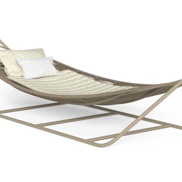 Cu forma sa originală, hamacul din colecția Panama este ideal pentru a-ți personaliza grădina. Deși generos ca dimensiuni, nu este voluminos, iar structura sa pare ușoară datorită cadrului din aluminiu și șezutului realizat din frânghii nautice sintetice. Mișcarea de balans este asigurată de corzi fixate ferm de structură, oferind un moment autentic de relaxare.